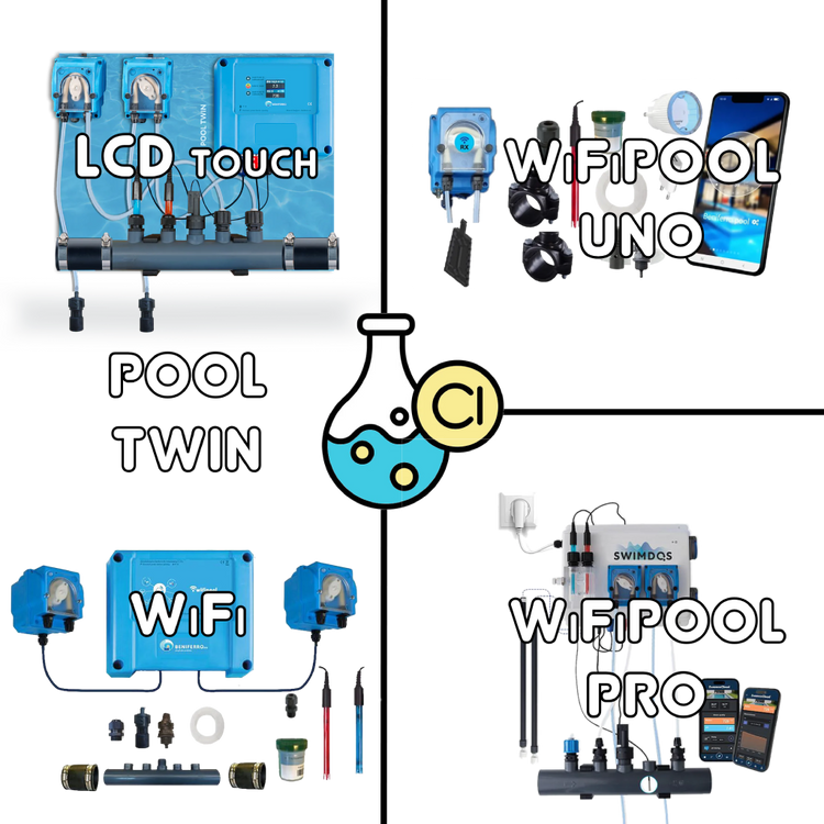 Ons assortiment bestaat uit plug&play of doe-het-zelf Chloor incl. pH doseertoestellen (POOL TWIN) of doe-het-zelf aparte Chloor en pH doseerpompen (WiFiPOOL UNO).