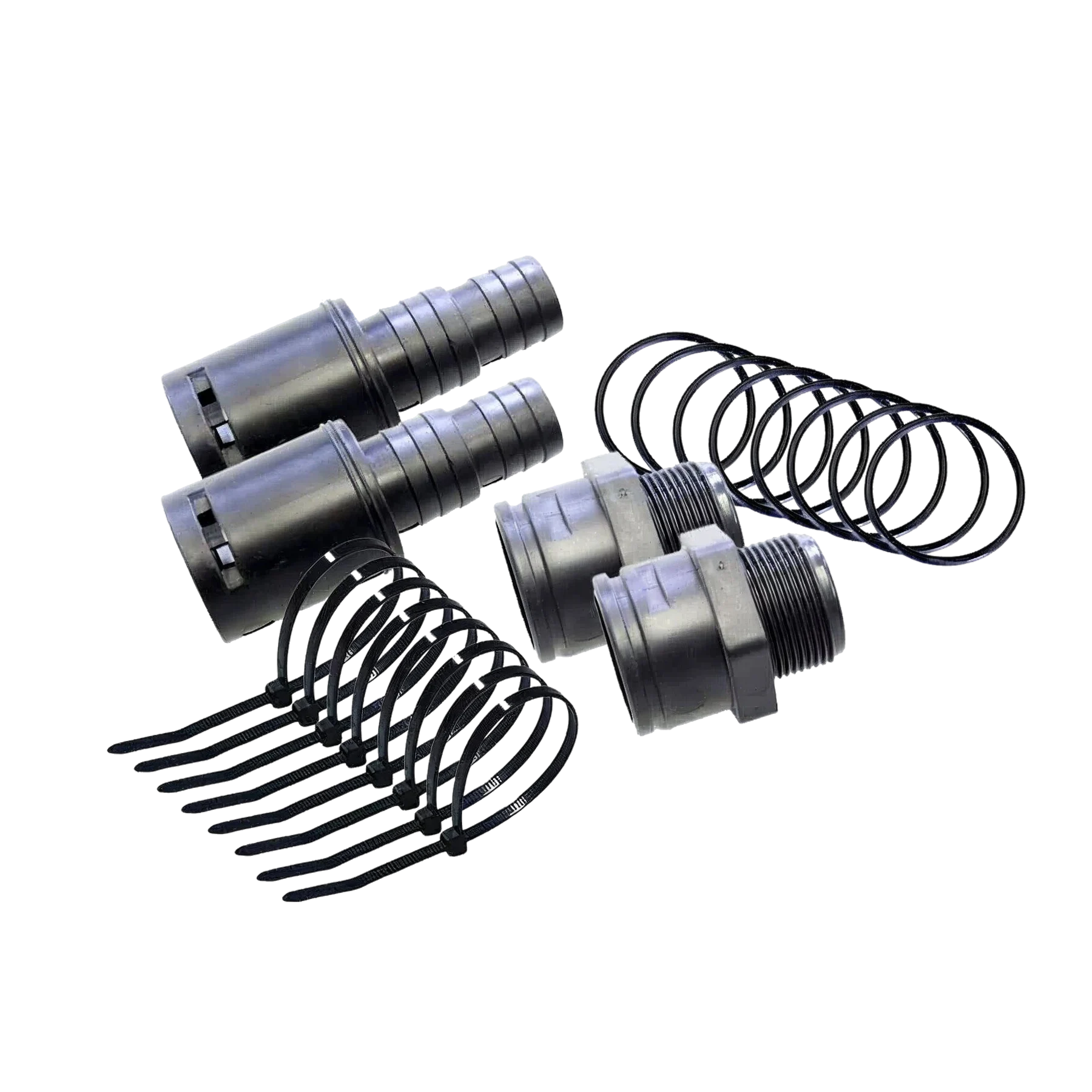 Inhoud : twee aansluitingen 32 - 38 - 50mm (te plakken), twee afsluitdoppen, 8 O-ringen en 8 kabelbinders