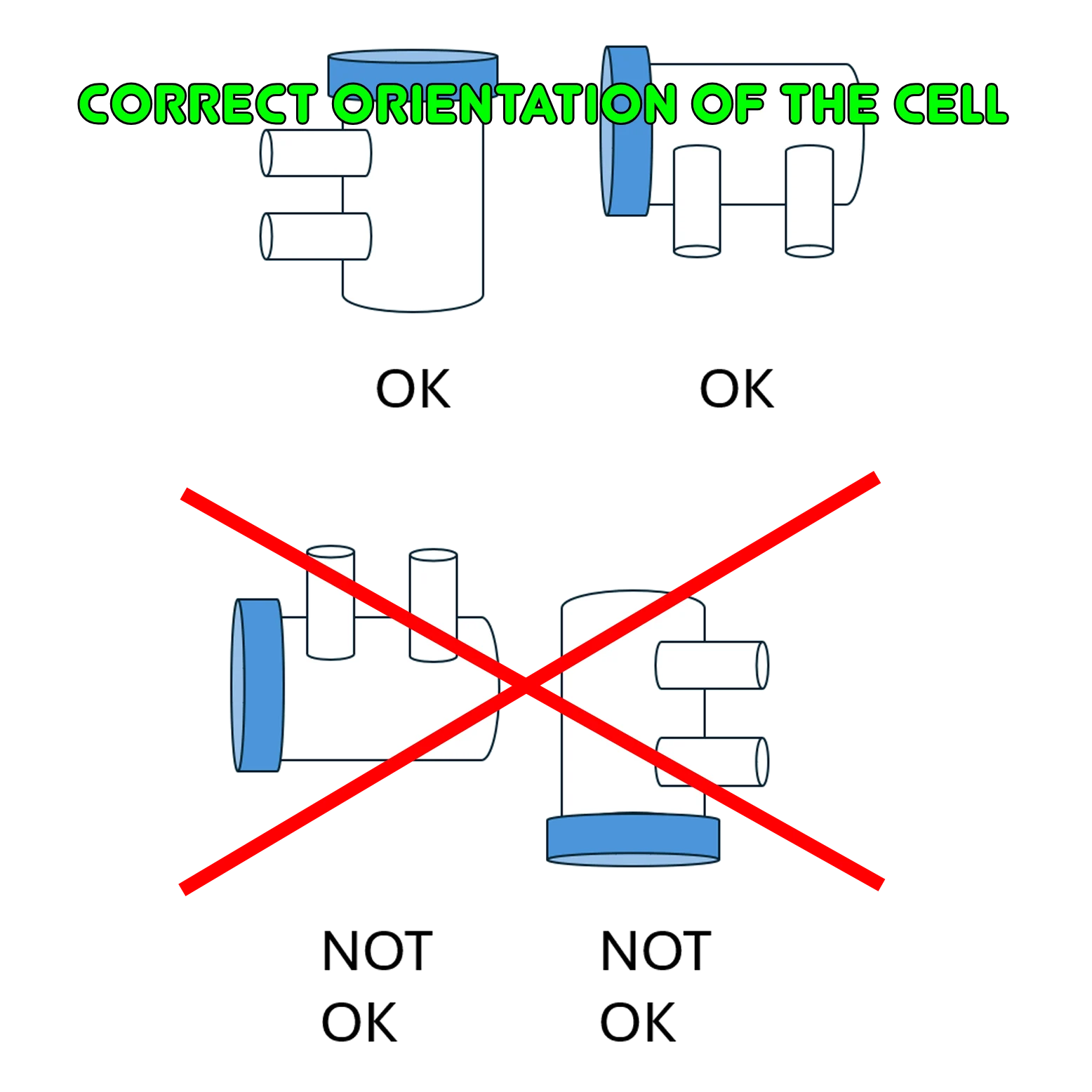 Het wordt aanbevolen de elektrolysecel op minder dan 1,5 meter afstand van de voedingskast te plaatsen, gemeten aan de lengte van de kabel die de cel met de voedingskast verbindt. De cel dient zo te worden geïnstalleerd dat gas in de cel kan opstijgen. Op deze manier schakelt de cel veilig over naar stand‑by als dat nodig is (bijvoorbeeld bij een onderbreking van de waterstroom). Om doeltreffend te kunnen functioneren, moet de flow/gas‑sensor (in het deksel) altijd boven de in‑ en uitlaat van de cel worden geplaatst. De doorstroomrichting in de cel zelf is niet van belang.