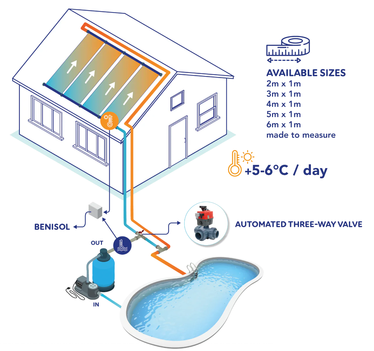 De geautomatiseerde temperatuurcontrole kit Wifipool bevat een gemotoriseerde WIFI driewegklep, de TLF-meetbox (Temperatuur x 2, niveau, debiet) met 2 thermokoppels en huls voor de temperatuursonde. De sensoren meten de daktemperatuur en watertemperatuur. Naarmate de zon de sensoren verwarmt naar een hogere zwembadwater- en daktemperatuur, zal de klep – dankzij de automatisering van de “Wifipool”-app – naar de stand “verwarmen” of "zwembad zonder verwarmen" draaien .